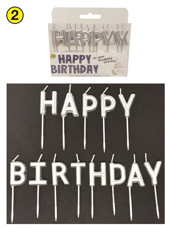 SET 13 CANDELINE SCRITTA ARGENTO “HAPPY BIRTHDAY”. . . ORDINE MINIMO 18 SET