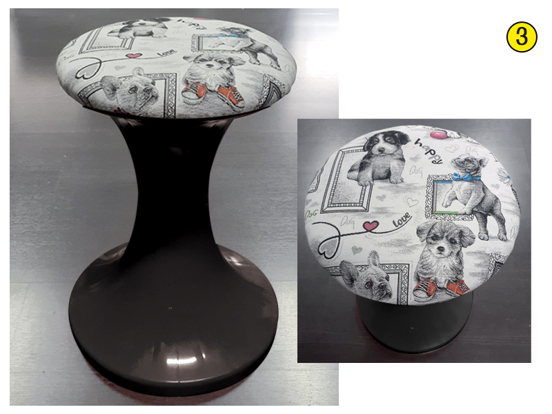 SGABELLO VINTAGE NERO “CANI” IN PLASTICA CON SEDUTA IN TESSUTO IMBOTTITA