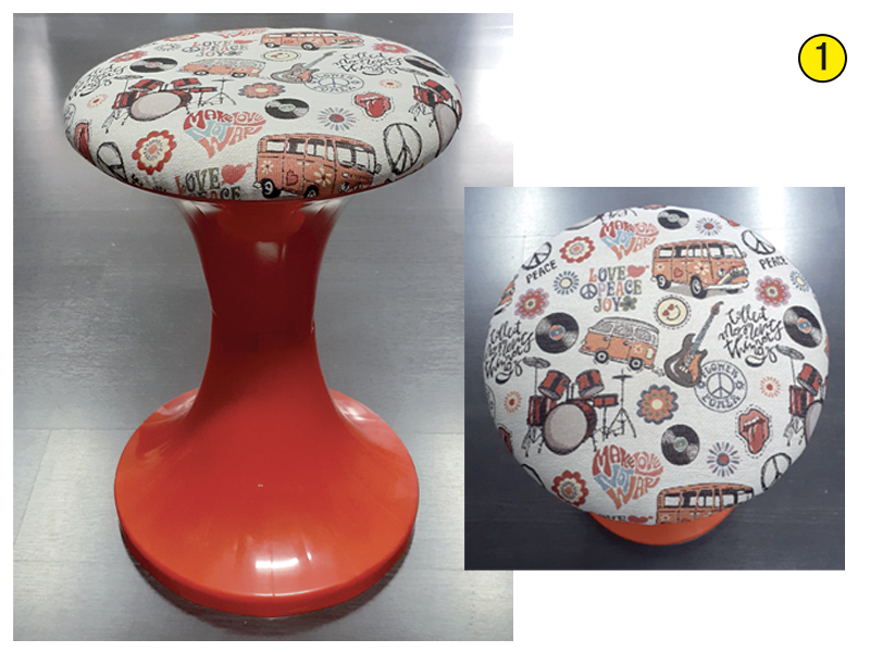 SGABELLO VINTAGE ROSSO “LOVE PEACE JOY” IN PLASTICA CON SEDUTA IN TESSUTO IMBOTTITA