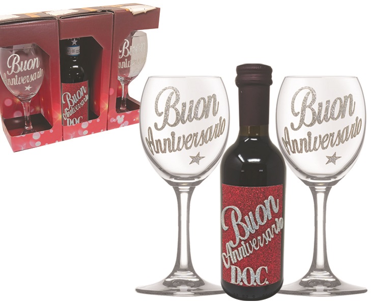 COPPIA CALICI + VINO DOC 25 cl BRILLANTINATO ANNIVERSARIO SCATOLA GIFT quantità