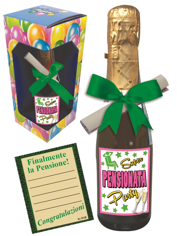 BOTTIGLIA PROSECCHINO cl 20 PENSIONATA CON FIOCCO E PERGAMENA DA PERSONALIZZARE – CON SCATOLA REGALO