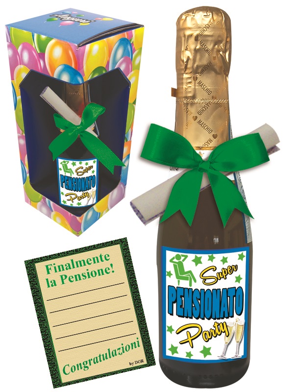 BOTTIGLIA PROSECCHINO cl 20 PENSIONATO CON FIOCCO E PERGAMENA DA PERSONALIZZARE – CON SCATOLA REGALO