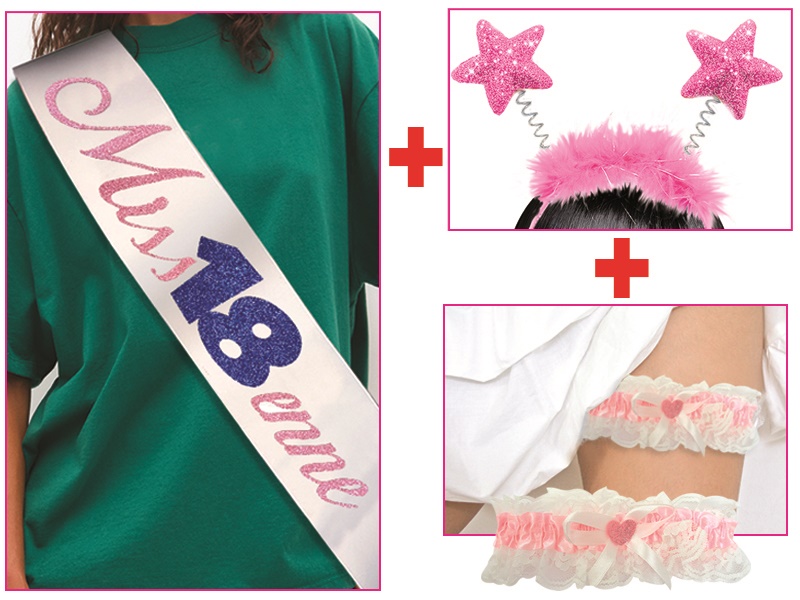 SET 18 ANNI CERCHIETTO STELLE + FASCIA SCRITTA GLITTER + GIARRETTIERA quantità
